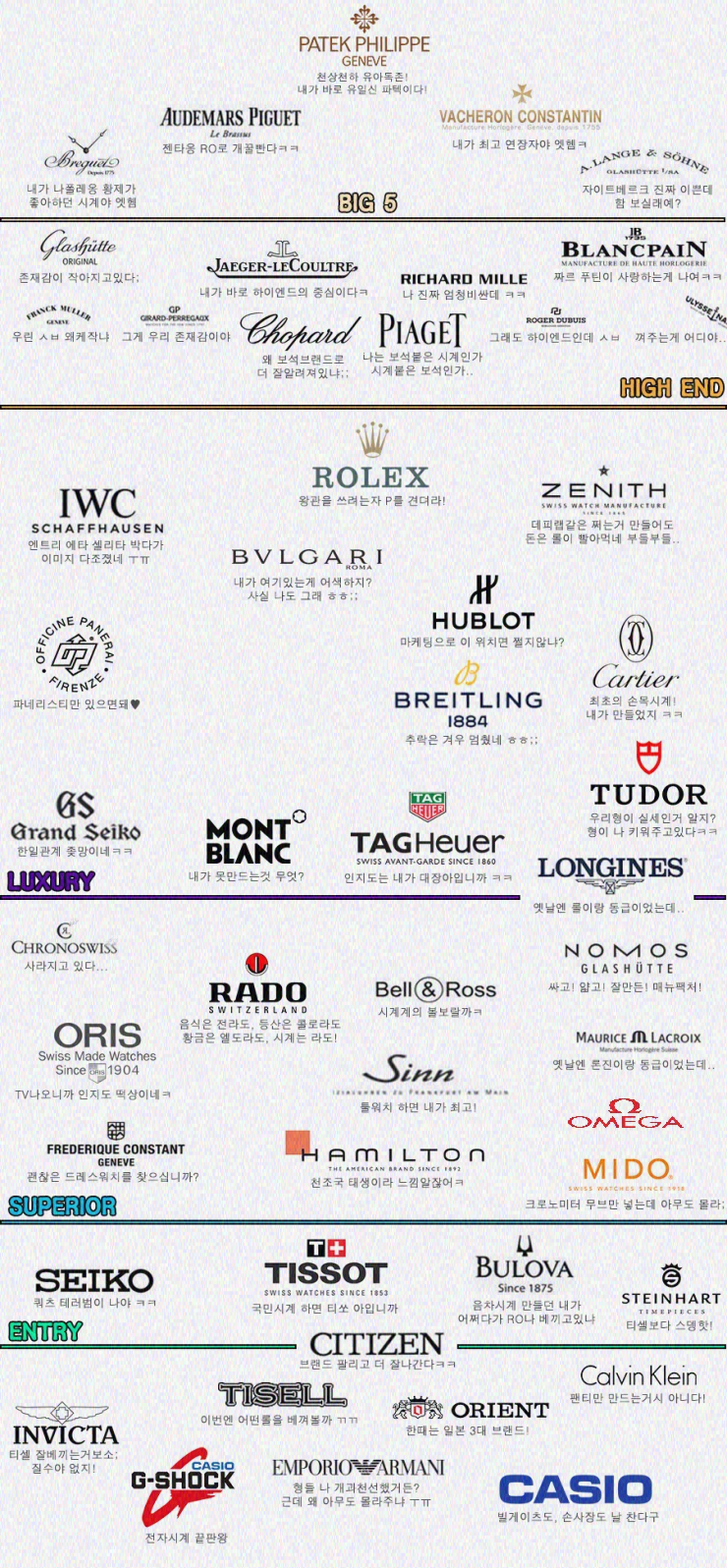 위 링크는 제가 남성 지갑 순위표를 포스팅한 건데 참고해주세요~! 이어서 남자 시계 순위표도 가져왔어요.다나랑 사이트에서 지갑 순위표에 이어서 손목시계 순위표도 만들었네요.순위표 작성을 정말 좋아하는군요(웃음)일단 시계 브랜드 최고봉 5개래요.파텍필립바쉐론 콘스탄틴브레게오데마피게아란에운팅자는 파텍필립과 오데마피게밖에 모르겠네요.이것도 힙합으로 매일 시계를 자랑해서 알았어요.가사를 보면 퍼텝필립~~ AP 어쩌고저쩌고 많이 나오더라구요..ㅋㅋㅋ다음은 S클래스에 속하는 브랜드입니다.예가르쿠르트 르블랑팡자케 드로질라드 페르고글루포지위 브랜드도 몇 천만원은 그대로 넘는 브랜드네요.한마디로 넘을 수 없는 벽…!!다음은 A+클래스에 속하는 브랜드입니다.제니스, 두 번째는 뭔지 모르겠어요 해리 윈스턴 율리스 나르덴 리처드 밀의 두 번째 브랜드가 뭔지 아시는 분 있어요?다음은 A클래스에 속하는 브랜드입니다.위브로 IWC 롤렉스 까르띠에반 클리프 아펠 이전에는 롤렉스가 시계 브랜드 중 거의 최고라고 생각했지만, 이 티켓을 보고 다르다는 것을 알게 되었습니다..(그러나 워너비 시계..ROLEX)다음은 B+클래스에 속하는 브랜드입니다.오메가 브라이트링 파넬라이 콜론 불가리 여기서부터가 가장 현실감 있는 시계 브랜드인 것 같아요.모델마다 다르지만 500~1000만원대로 생각해주세요.다음은 B클래스에 속하는 브랜드입니다.태그호이어 벨 앤 로스 론진 몽블랑 에르메스는 고가의 브랜드이지만 시계 브랜드로는 B클래스에 위치하고 있군요.태그호이어 카레라 캘리버 5 데이데이트 칠판 사용후기 밤슈타인입니다. 반갑습니다.이번 포스팅에서는 대구호이어 카레라 칼리버 5 데이데이트 블랙 구매후기 포스팅… blog.naver.com그리고 태그호이어 시계는 제가 포스팅을 한번 했는데 궁금하신 분들은 참고해주세요.(귀신시계 태그호이어 카레라 5데이 데이트입니다)다음은 C클래스에 속하는 브랜드입니다.노모슬라드보메메르시에프레데릭콘스탄트튜더여기서는개인적으로프레데릭콘스탄트문페이즈제품을좋아해요(웃음)다음은 D클래스에 속하는 브랜드입니다.해밀턴 티쏘세이 커밋 오리스 여기서는 해밀턴이 가성비 시계로 유명하죠~!해밀턴 부엉이나 재즈 마스터가 인기랍니다.다른 브랜드도 좋아요.100만원대나 100만원 이하 브랜드요.다음은 E클래스에 속하는 브랜드입니다.스와틸미녹스 카시오주 작시티즌 쥬샤쿠는 군인분들의 필수아이템입니다 실용성도 좋고 디자인도 예뻐서 인기가 많습니다.군인분들이 선물을 많이 받았어요.다음은 F클래스에 속하는 브랜드입니다.다니엘 웰링턴 지씨마크 제이콥스 브리스톤 컬뱅크라인 타이맥스 포체알마니스카겐폴스미스케네스콜 가격대도 저렴하고 실용성이 좋고 디자인도 예쁜 브랜드가 많네요.지금까지 시계 브랜드 순위를 살펴봤습니다.포스팅을 하면서 검색을 해봤는데 인터넷에 떠도는 또 다른 남성시계 브랜드 순위표가 있더라고요.위에 본 표와 비슷하지만 다양한 브랜드가 추가되어 있어서 가져왔어요.참고로 이 순위표가 다 맞는건 아니니까 참고용으로 봐주셨으면 좋겠어요(웃음)그냥 시계를 구입하기 전에 어떤 브랜드가 있고 가격대는 얼마 정도인지 참고하는 용도로 보면 되겠네요.그리고 고가 브랜드의 시계 제품은 품귀 현상 때문에 가지고 있으면 그 가치가 점점 올라간다고 합니다.(파텍 필립 노틸러스, 롤렉스 서브마리너 등..) 다음 포스팅에서는 어떤 브랜드의 제품이 품귀 현상이 심해 가치 투자용으로 좋은지 알아보겠습니다.